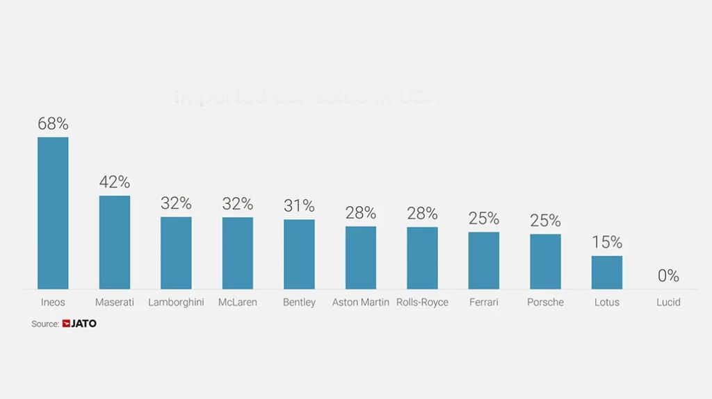 Secondo i dati forniti da Jato, nel 2024 negli Stati Uniti è stata registrata la vendita di 16,1 milioni di autoveicoli leggeri. Di questi, circa 6,3 milioni erano prodotti prevalentemente dal Messico, Canada, Unione Europea, Regno Unito, Giappone e Corea del Sud, regioni che dovranno affrontare un dazio del 25% In relazione all'export di veicoli negli Stati Uniti. In aggiunta, dalla data del 3 maggio 2025, tali disposizioni verranno ampliate per coprire anche i componenti prodotti automobilistici esportati all'estero.