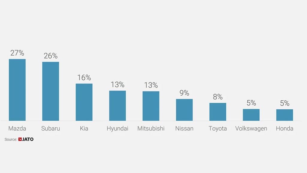 A paragone, le tre maggiori marchi giapponesi (Toyota, Honda e Nissan) hanno commercializzato complessivamente 17,9 milioni di veicoli a livello mondiale, tra cui 1,53 milioni di unità che sonostate importati e venduti sul mercato americano. 9% ).