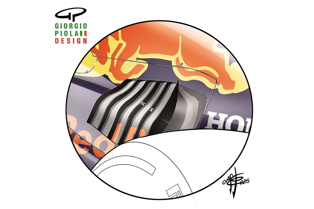 Le elevate temperature registrate durante il fine settimana non hanno colto impreparati i tecnici della squadra di Milton Keynes. La Red Bull ha quindi attivato le ampie prese d'aria laterali sul cofano motoristico, introducendo sei fessure notevoli per facilitare l'estrazione del calor generato dall'unità propulsiva Honda.